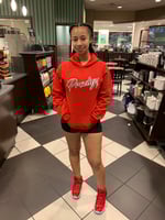 Red script hoodie with black and white writing